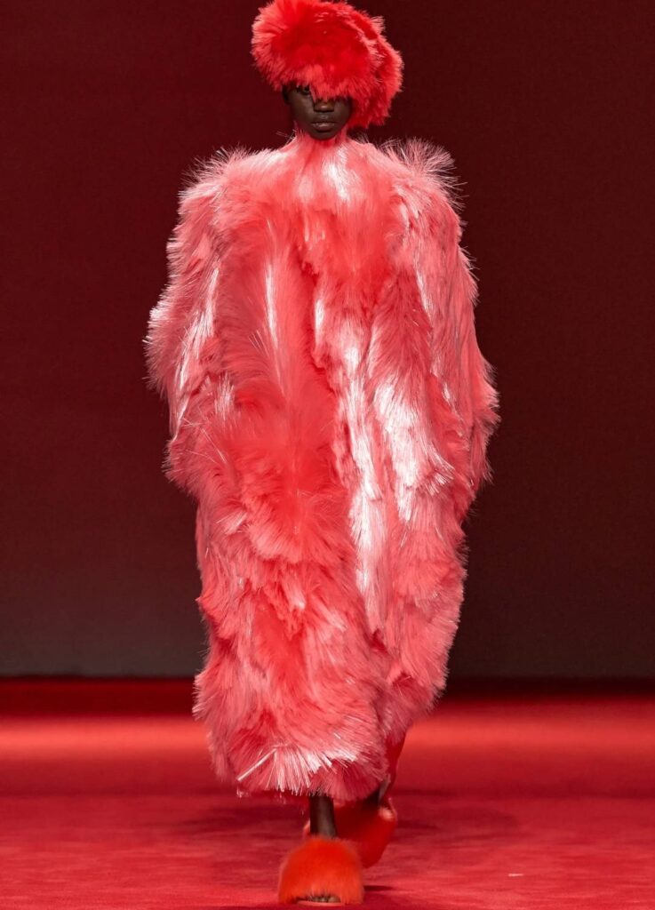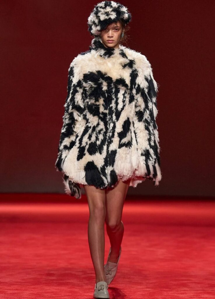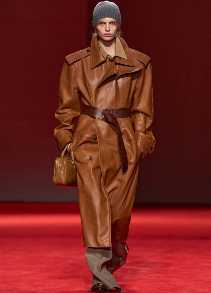 The red runway—deep, immersive, and uninterrupted—functioned not as theatrical decoration but as a strategic device. Against the saturated background, leather surfaces, woven textures, and fur volumes appeared sharper and more sculptural.