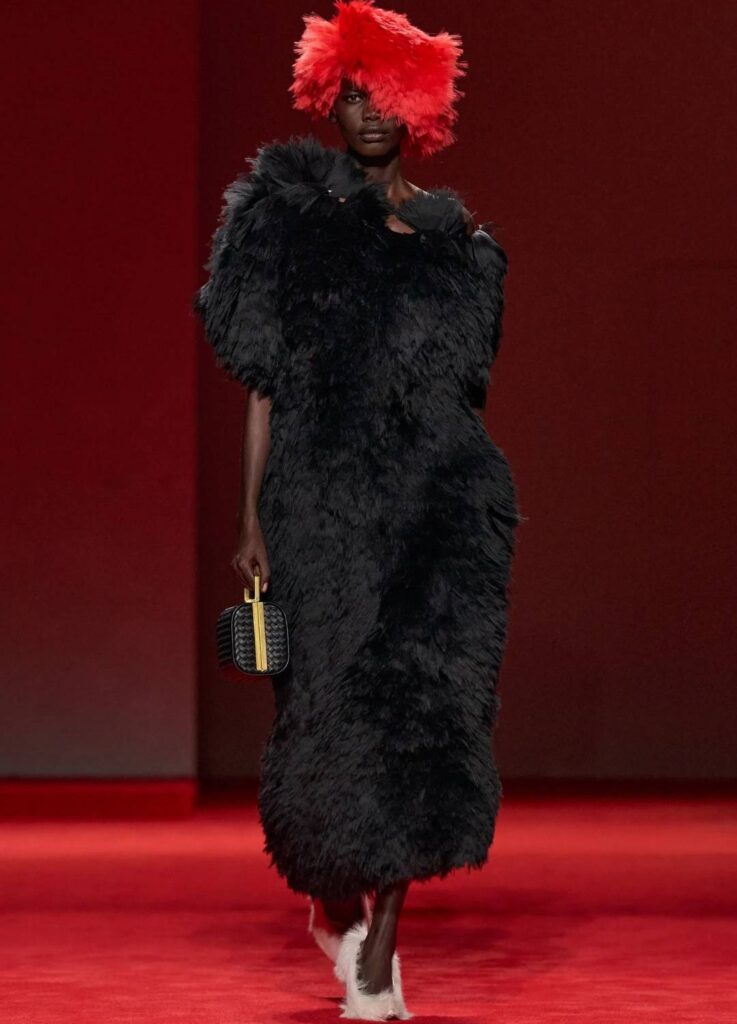 Sculptural fur dresses with minimal visible tailoring lines.