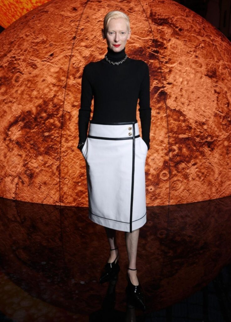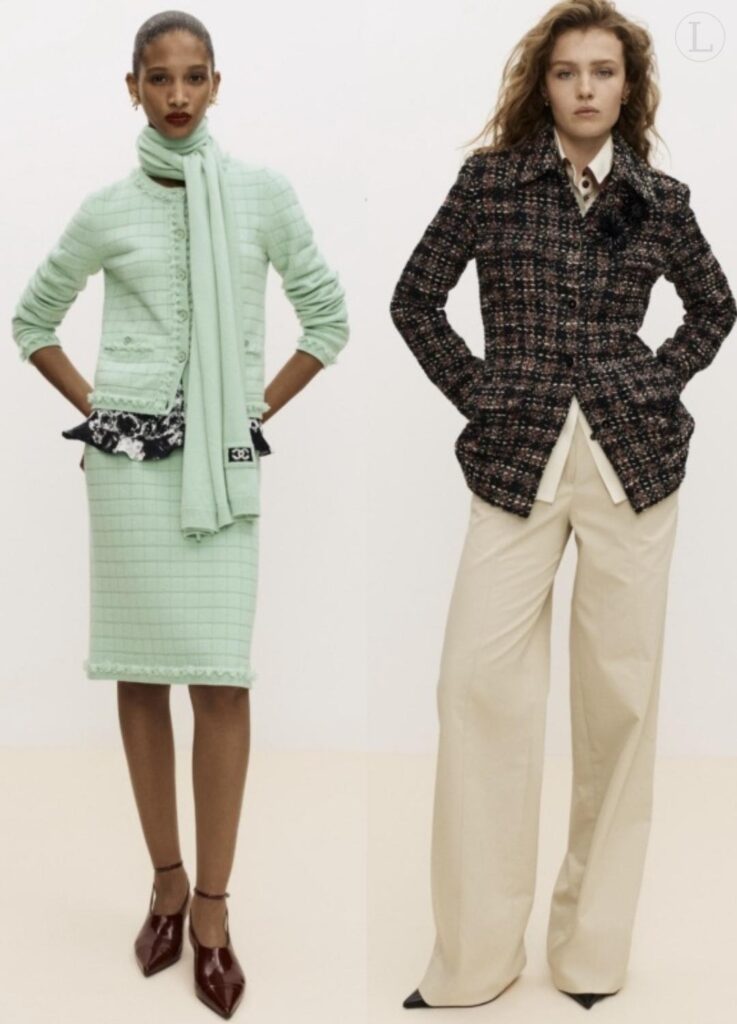 Chanel’s linear tweed patterns prevent visual expansion through the hips.