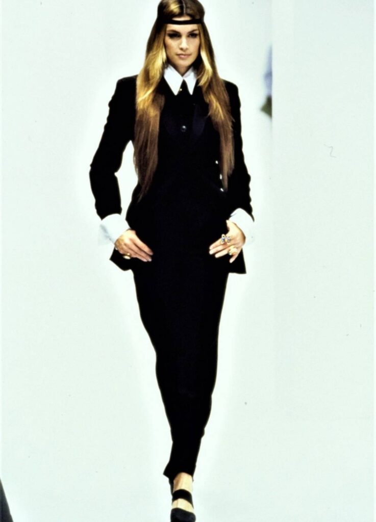 While the house has explored ornamentation and baroque embellishment in other periods, the early 1990s collections frequently emphasized structured jackets, defined waists, and contrast between tailored exteriors and intimate underlayers.