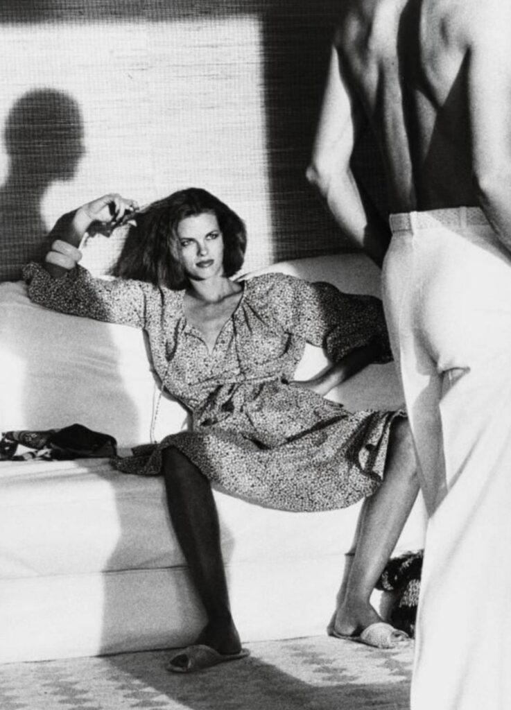 While no official reference to specific photographers was stated in show materials, the visual language—controlled gaze, seated or poised posture styling, restrained sensuality—recalls the broader aesthetic associated with 1970s fashion photography.