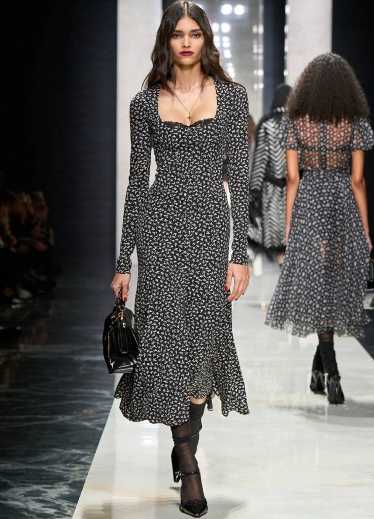 Toward the conclusion of the show, micro-print dresses appeared, softening the architectural severity of the earlier looks.