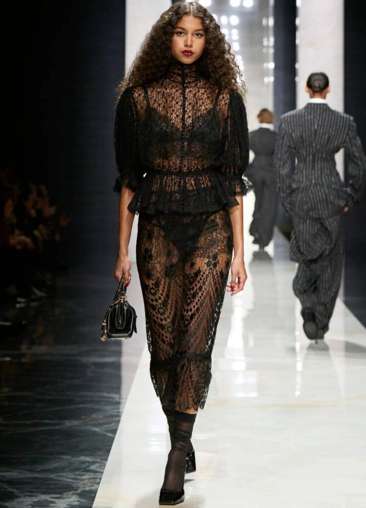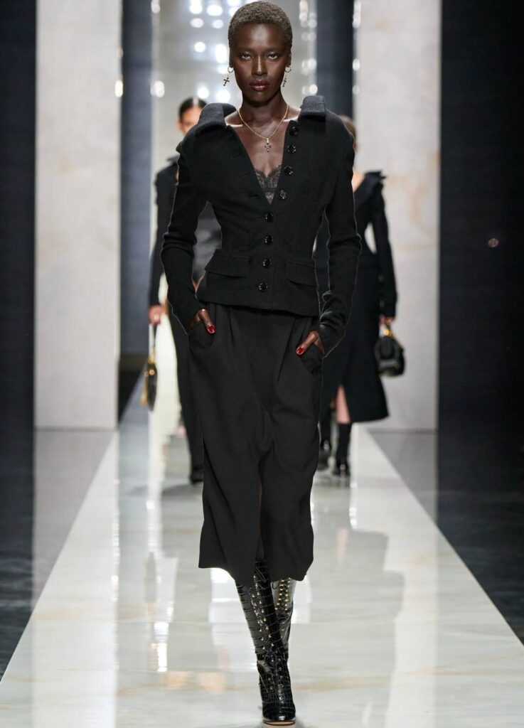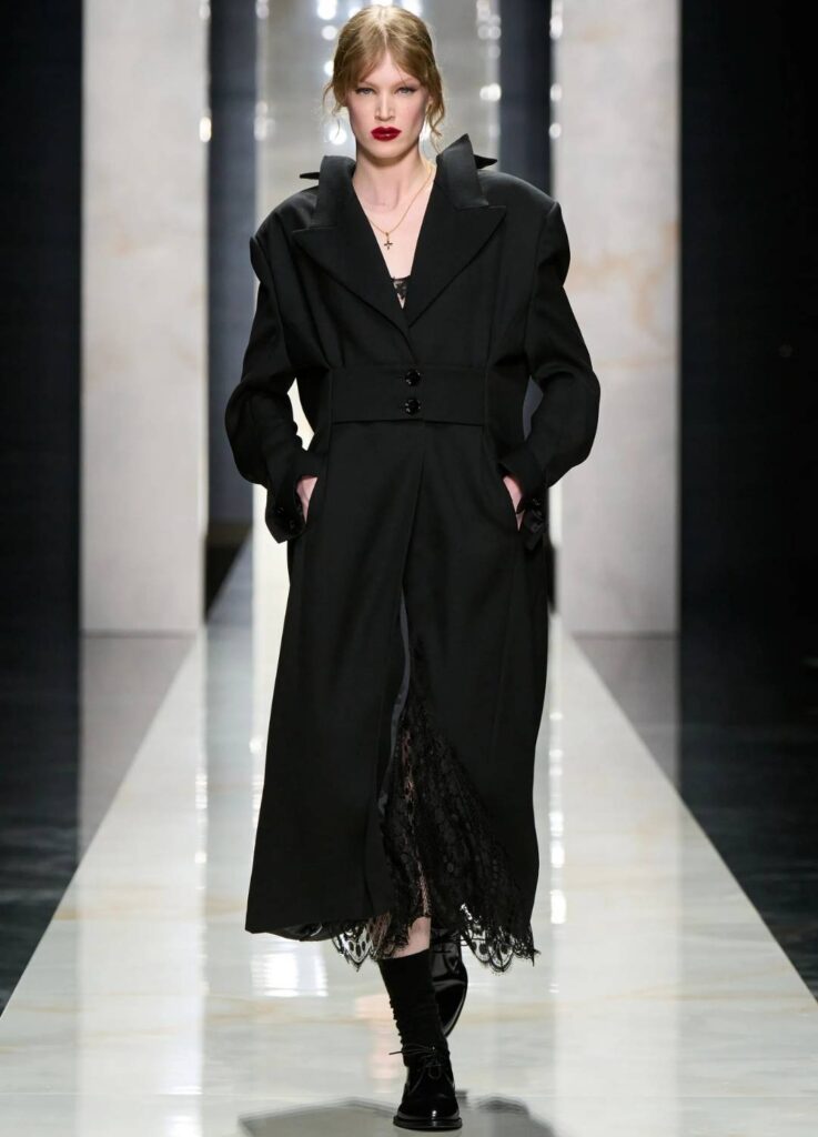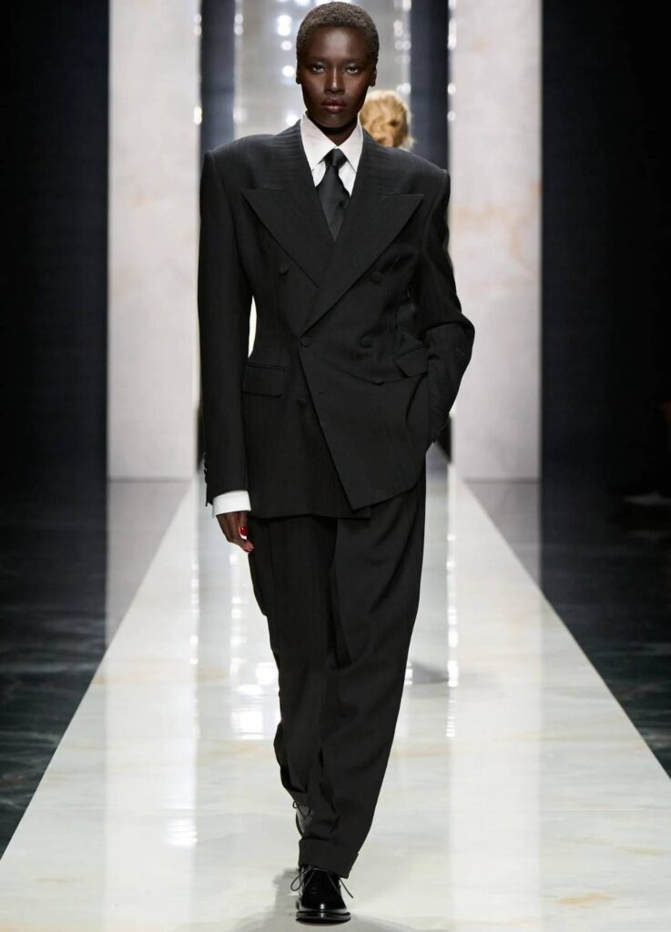 The emphasis was placed on black tailoring, structured femininity, and the tension between masculine suiting and sensual layering—elements historically associated with the house.