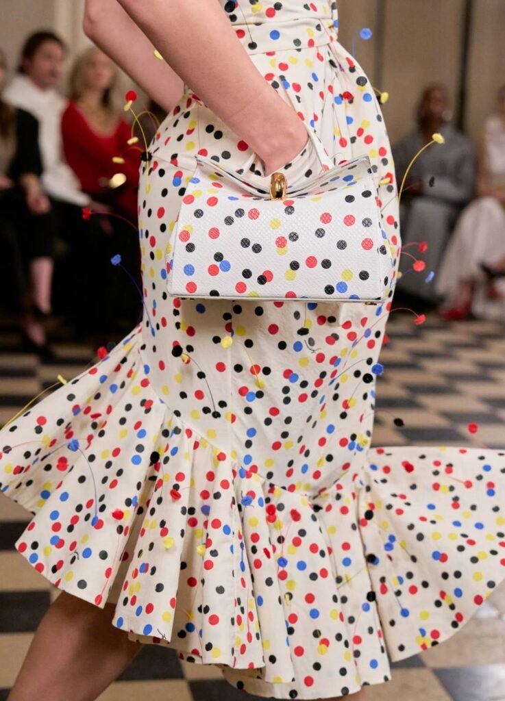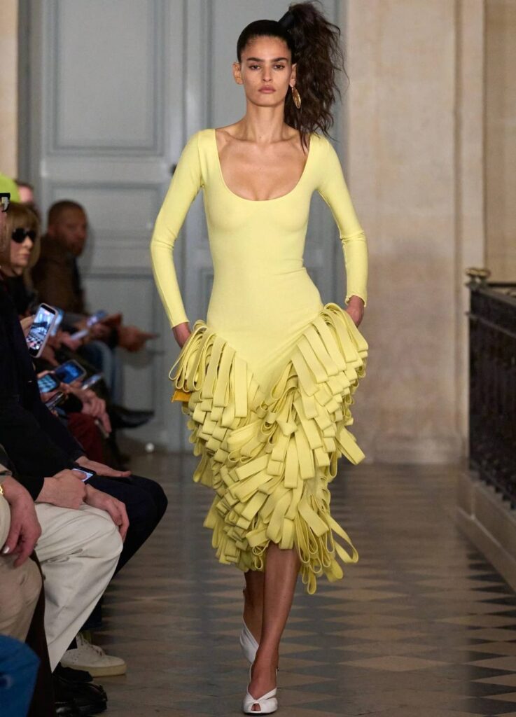 The palette moves deliberately between black, ivory, sand, butter yellow, and flashes of red. Even brighter hues—turquoise, mint, lemon—are tempered by silhouette. Color no longer shouts; it resonates.
