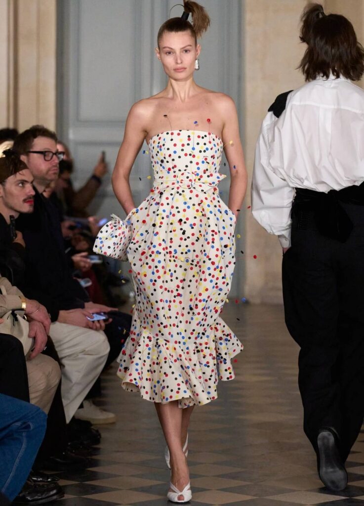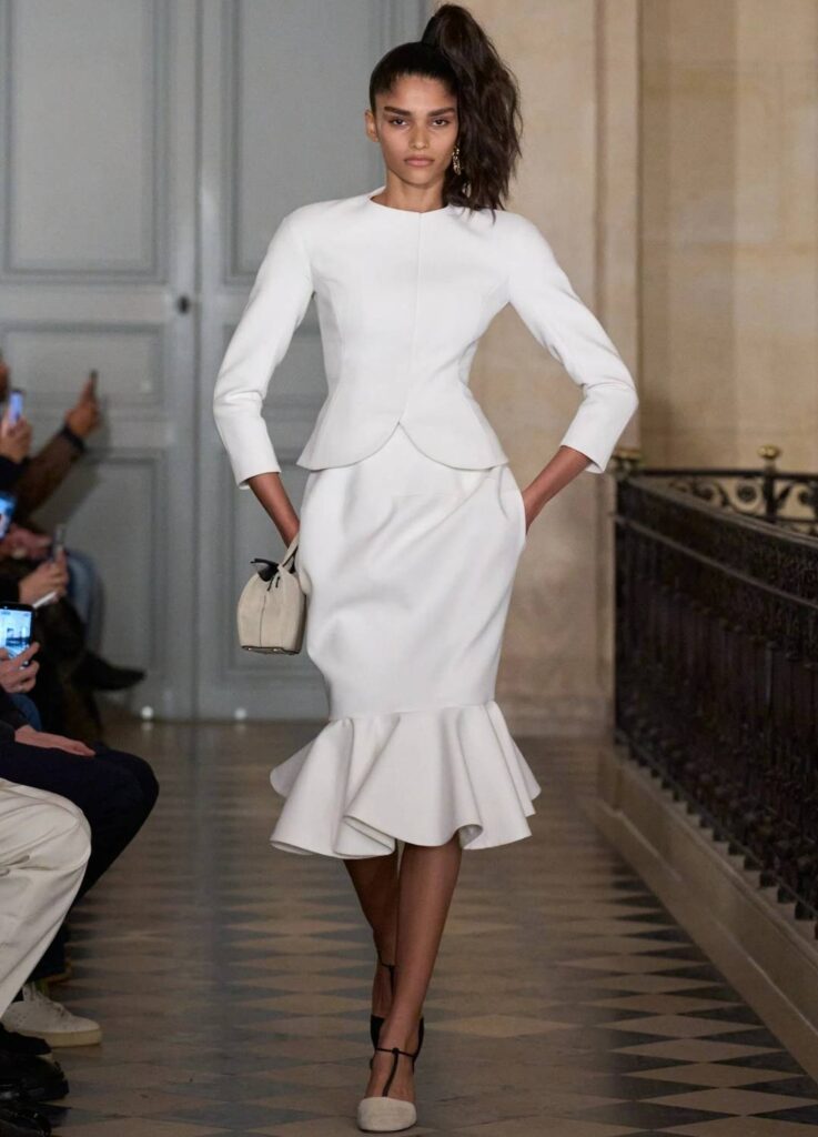 References to mid-century couture—particularly the 1950s and 1980s—surface throughout the collection, but never as quotation. Instead, they function as structural memory.