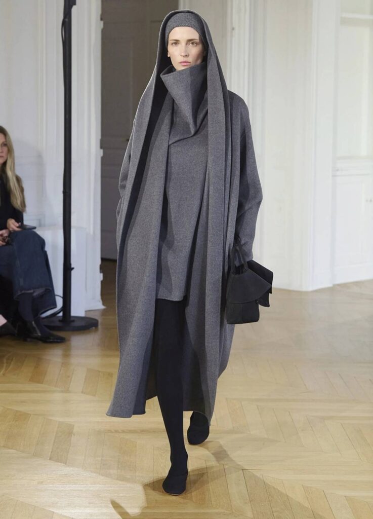The most notable evolution in Fall 2026 lies in the direction of the silhouette. Where earlier TOTEME collections leaned into architectural tailoring and linear coats, this season moves inward—toward forms that encircle and shelter the body.