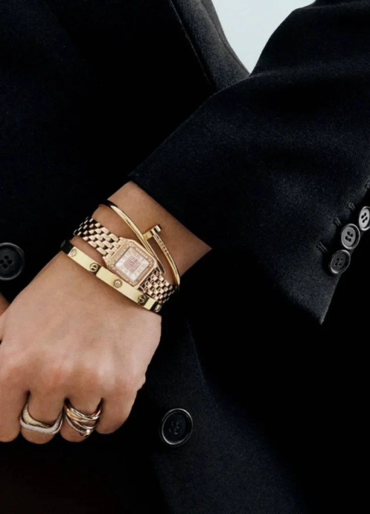 Crucially, contemporary jewelry design has evolved to accommodate this shift. Leading houses now produce fully resolved forms without diamond reliance—bold rings, solid bangles, uninterrupted chains—designs that allow gold itself to perform visually.